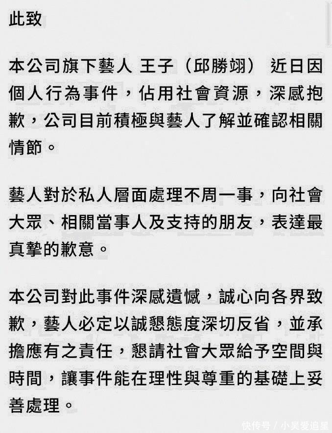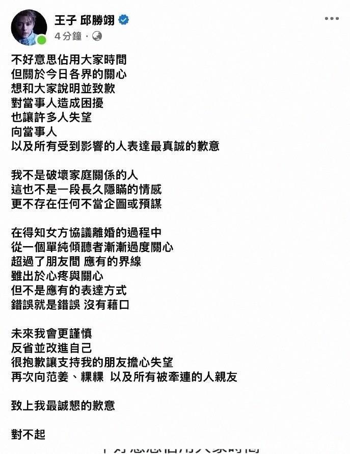 王子在晚上发了长文,语气克制他承认与粿粿“有超越朋友的关系”,但强调自己不是破坏婚姻的人这句话是关键,一方面直面关系越界,一方面把时间线压在“女方协议离婚的过程中”他的说法是:原本只是倾听,后来太过关心,超过了朋友应有的界线这份“从关心到过界”的自述,像是为动机“降温”,可界线一旦踩过去,公众不会只看动机他写了句“错误就是错误,没有借口”,这句直白的话比任何专业措辞都更有冲击经纪公司的声明很快跟上喜鹊娱乐用“私人层面处理不周”这一表达,向大众与相关当事人致歉,并称艺人会反省、承担应有责任